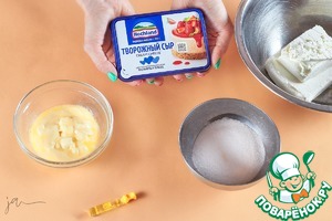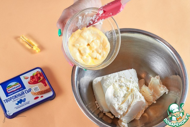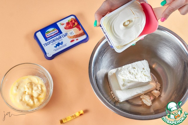 Для его приготовления идеально использовать жирный фермерский творог, но не всегда его можно достать. Поэтому беру самый качественный творог в магазине и дополняю его творожным сыром Hochland для кулинарии.
