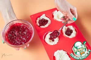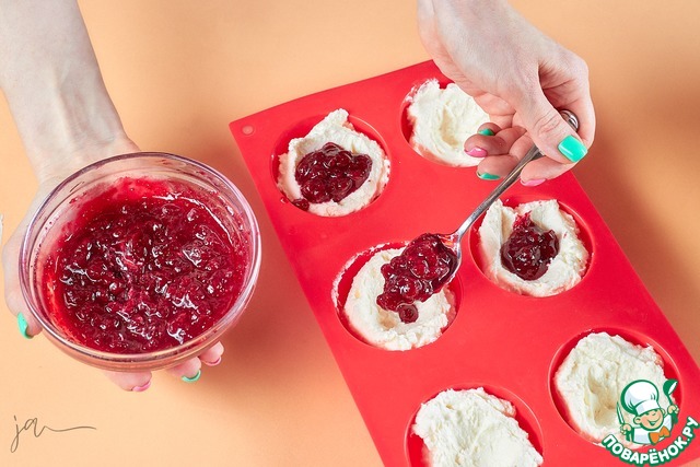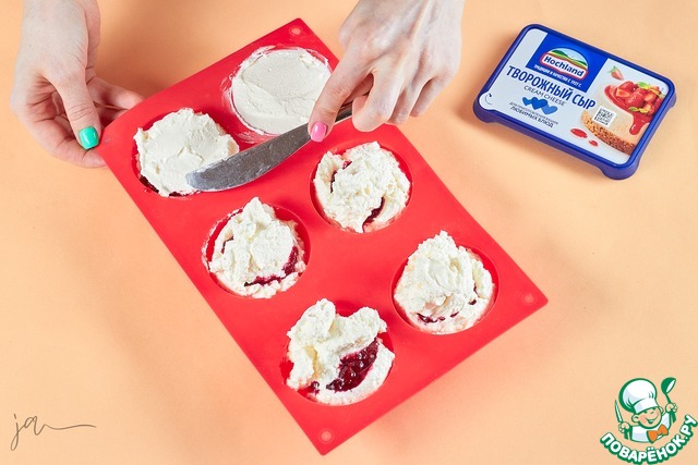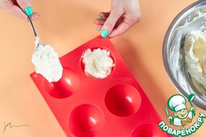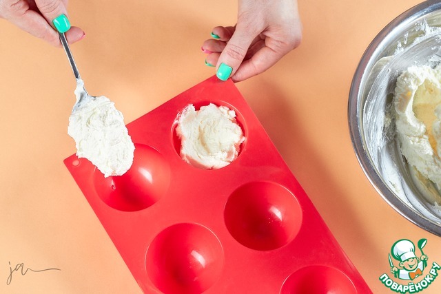 Приступаем к сборке. В продаже можно найти прямоугольные формы, которые сделают сырок точной копией магазинного. Я взяла полусферы. Выложить творожную массу, в середине сделать углубление для начинки.