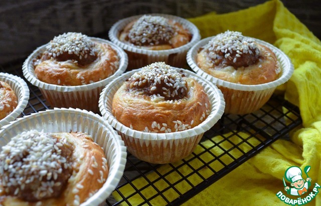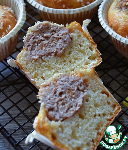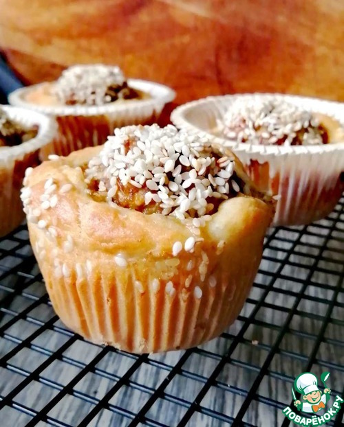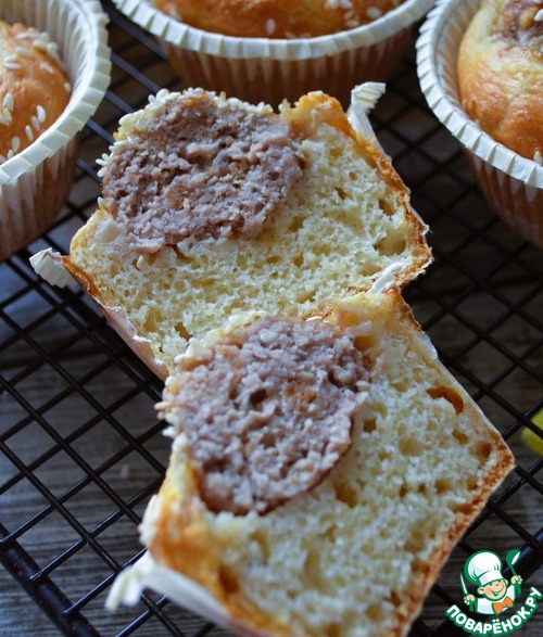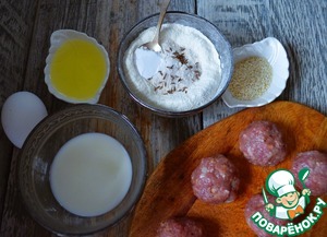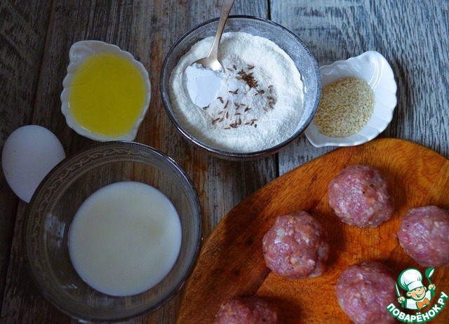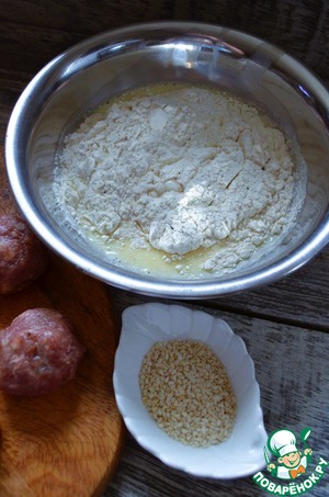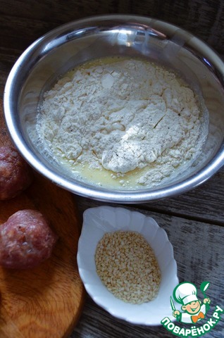 В центр теста положить мясной колобок, присыпать кунжутом.