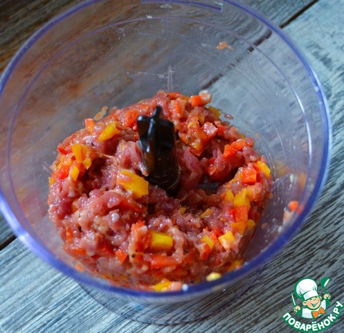 Перцы нарезать мелким кубиком, чеснок измельчить, смешать с рубленой индейкой. Добавить соль, перец.