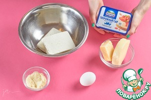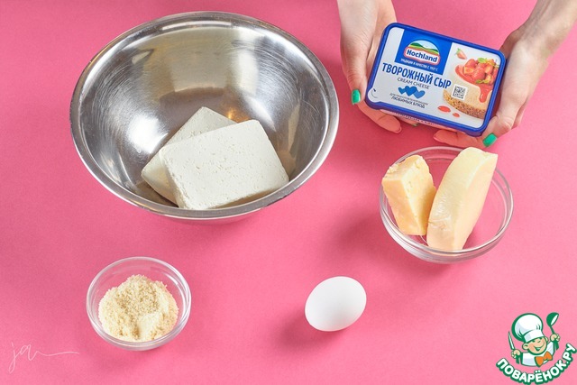 Жирность творога напрямую влияет на вкус сырников, но натуральный выше 9% в магазинах продается редко. Поэтому дополним его творожным сыром Hochland для кулинарии.