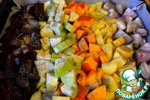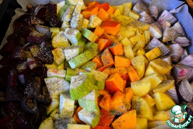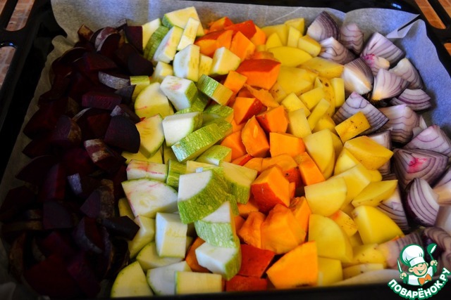 Овощи хорошо промыть, нарезать одинаковыми небольшими кусочками. Лук нарезать на 8 частей. Выложить на противень.