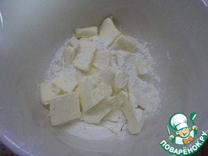 Для теста смешайте муку с солью и добавьте кусочки холодного сливочного масла.