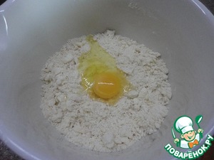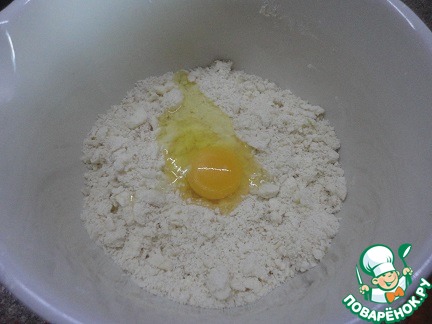 Перетереть руками в масляную крошку. Добавить яйцо и холодную воду. Замесить тесто и убрать в холодильник на 1 час.