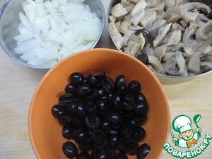 Для начинки лук нарежьте мелкими кубиками, грибы кусочками, маслины пополам.