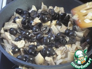 Лук обжарить до золотистого цвета, затем добавить грибы с маслинами и жарить до готовности грибов. Время готовки зависит от сорта грибов.