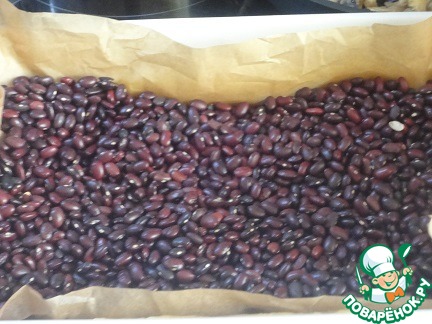 Нагреть духовку до 200С. Тесто выложить в форму для запекания, сформировать бортики. Затем застелить пергаментом и насыпать утяжелитель (горох, фасоль и т. п.) и выпекать 20 минут.