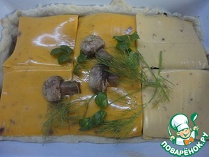 Дно формы с тестом выложить пластинками сыра, а на него начинку. Сверху накрыть оставшимися пластинками сыра и украсить грибами (по желанию).