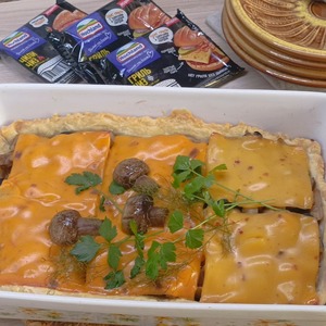 С самого начала конкурса я решила готовить этот пирог именно с сыром "гриль-чиз", с его копченой ноткой. Для формы моего размера двух упаковок не хватило. Я думала, там 8 пластинок, а в них оказалось всего по 5 шт. Поэтому я добавила пару пластинок имевшегося у меня "чили-чиза". Я готовила с лесными грибами. Вы можете выбрать свои любимые. Количество теста идеально подошло для моей формы 27 х 17.