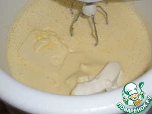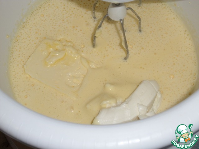 Добавляем в чашу миксера творожный сыр и размягченное сливочное масло.