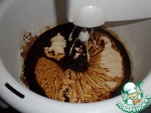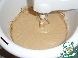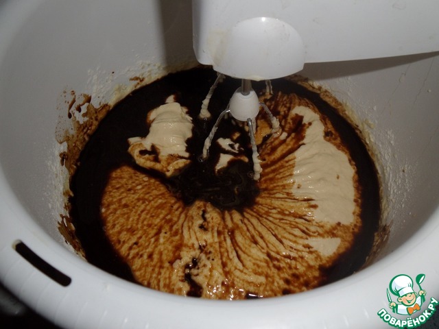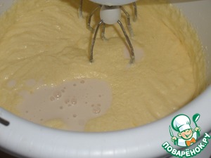 Добавляем ряженку. Взбиваем смесь до однородности на малых оборотах миксера.
