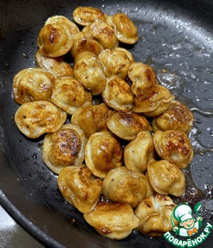 Три минуты с одной стороны, три с другой. Чтобы слегка-слегка корочка хрустявая образовалась. Хлопотно. Пельмени надо с ровным слоем на сковороду выкладывать, потом переворачивать каждый. Но! Надо!