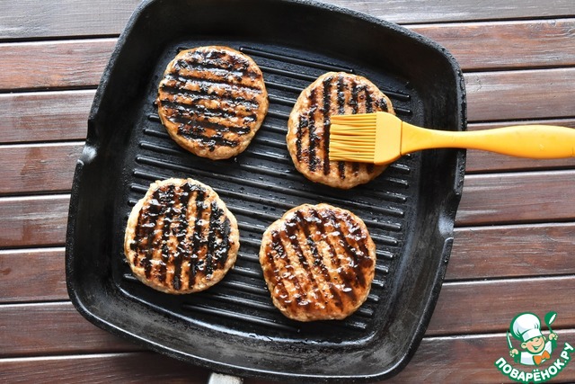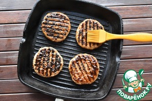 Из фарша формируют восемь плоских котлет, слегка смазываю их растительным маслом и обжариваю на гриле с двух сторон. Когда одна сторона обжарится, переворачиваю и смазываю густым слоем оставшегося соуса из терияки и ананасового сиропа.
