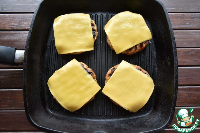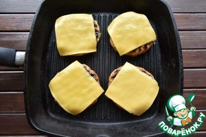 На готовые котлеты выкладываю по ломтику плавленного сыра.