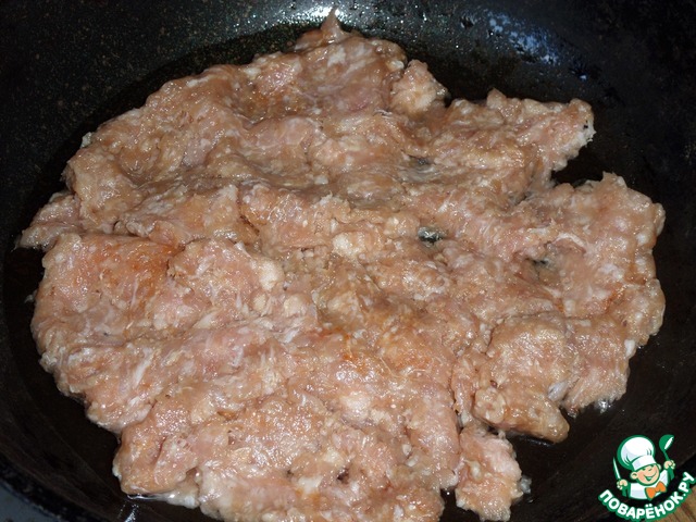 Сковороду ставим на огонь. Наливаем растительное масло. Выкладываем мясной фарш.