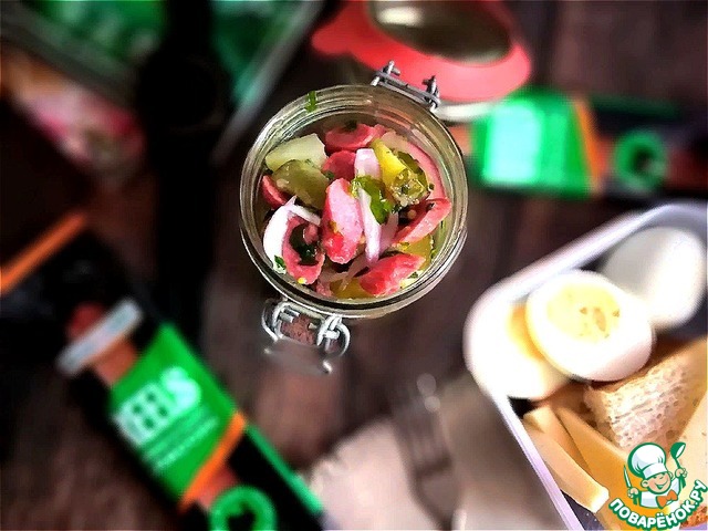 Если мы берём ссобойку с салатом на перекус, то поместим его в баночку под крышку. Сварим к нему пару яиц вкрутую, возьмём хлебушка и сырку. Сытный перекус готов.