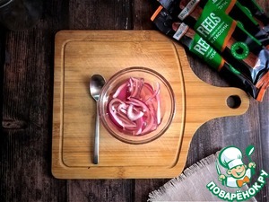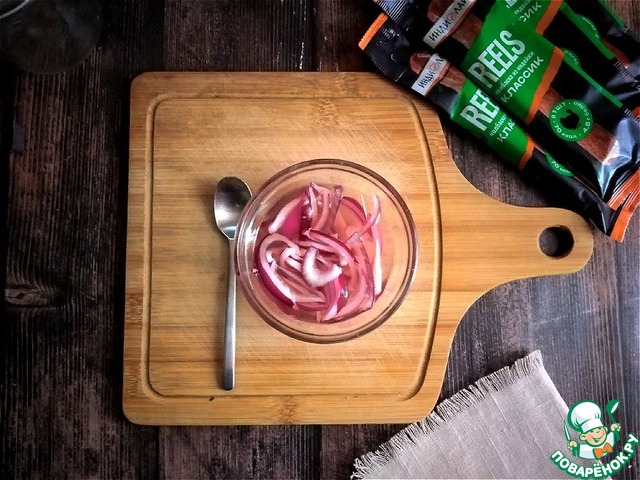 Красный лук замаринуем. Его нужно порезать перьями, поместить в стеклянную посуду и залить яблочным уксусом, добавив воду и сахар. Маринуем его пока готовим салат.