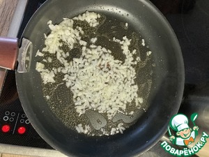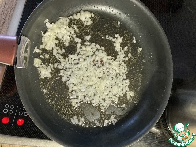 Разогреть сковороду, добавить оливковое масло. Обжарить лук до золотистого цвета, уменьшить огонь.