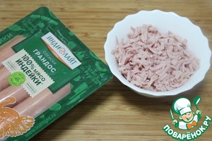 Сосиски натереть на крупной терке или очень мелко порезать.