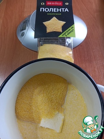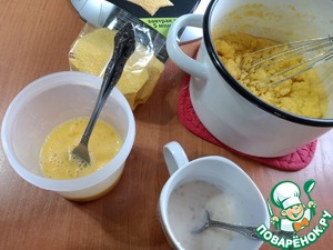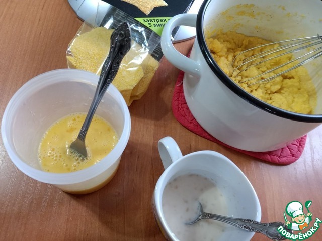 Пока остывает полента, оставшееся молоко немного подогреть и развести в нем дрожжи, в отдельной миске взбить яйца