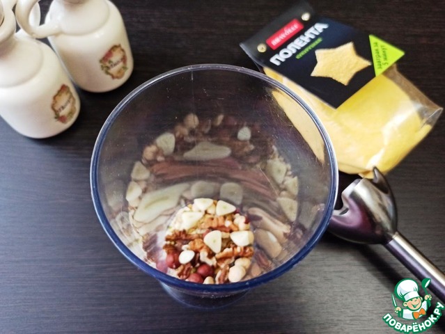 Приготовить соус для шариков из поленты. Миксером измельчить подсушенные орехи и чеснок с добавлением воды. Пропорции не скажу, я на глаз готовлю. Поэтому лучше воду вливать понемногу.