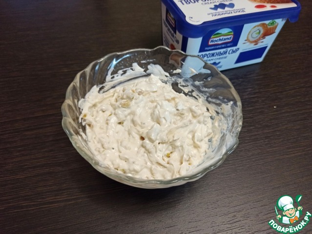 Оливки мелко нарубить ножом. В миске смешать творожный сыр Hochland, оливки, сухой чеснок, добавить несколько капель острого соуса Табаско. Можно добавить каких-нибудь специй на ваш вкус. Я посыпала сухими итальянскими травами.