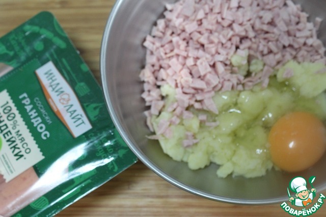 • В чашу выложить картофельное пюре, добавить сосиски, чесночный порошок, яйцо и соль.