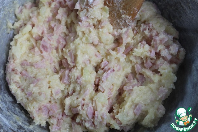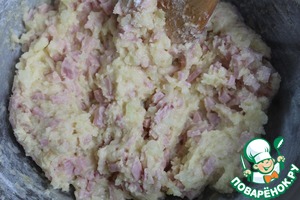 В чашу выложить картофельное пюре, добавить сосиски, чесночный порошок, яйцо и соль.