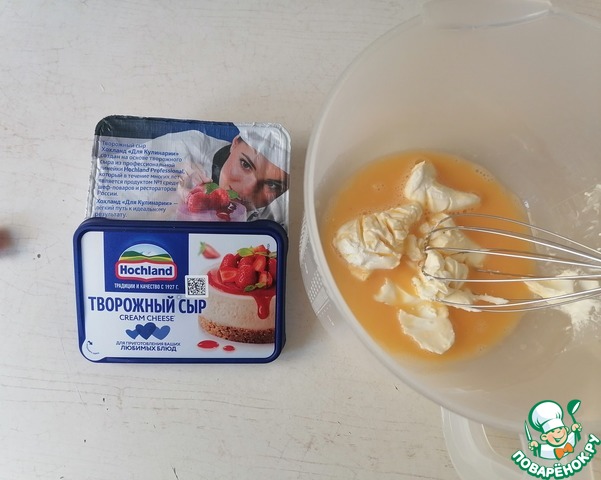 Яйцо взбить венчиком, добавить творожный сыр и перемешать