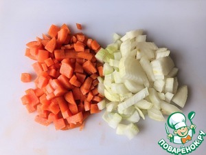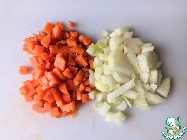 Лук и морковь моем, чистим. Режем кубиками. Можно, конечно, морковь натереть на тёрке, но кубиками будет смотреться красивее в готовом продукте в разрезе.