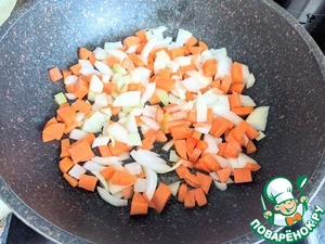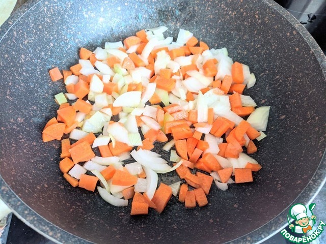 На горячую сковороду наливаем масло, кладём лук и морковь, обжариваем на среднем огне до мягкости, около 10 минут.