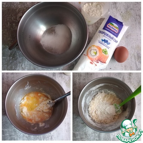 Делаем тесто. В посуду помещаем сыр творожный, разбиваем яйцо, кладём сахар и соду. Соединяем. Сода погасится в творожном сыре. Понемногу выкладываем муку, добавляем маленькую щепотку соли. Я работала в начале силиконовой лопаткой, а затем руками. Сильно мукой не забивайте. Как перестанет тесто липнут к рукам, можно его раскатывать. Тесто мягкое.