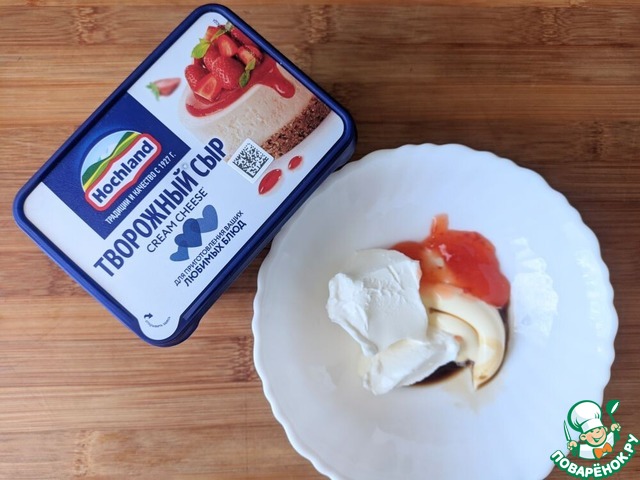 Готовим заправку. Смешиваем творожный сыр, сметану, майонез, кисло-сладкий соус чили, соевый соус. У меня творожный сыр Hochland.