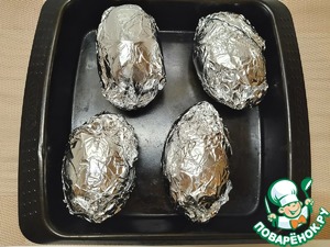 • Картофель хорошо промыть, обсушить. Завернуть в фольгу. Звпекать в духовке 1 час 20 минут или 1 час 30 минут при 180С.