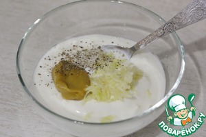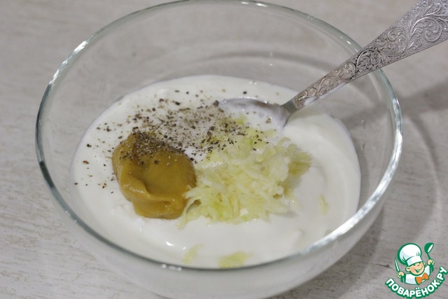 Приготовить йогуртовый соус: к йогурту добавить измельчённый чеснок, горчицу, соль и перец по вкусу.