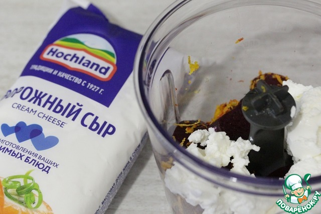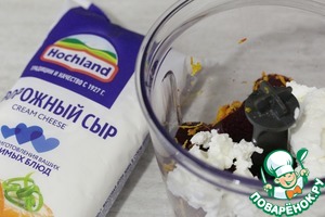 Туда же добавить творожный сыр (у меня ТМ Хохланд в рукаве).