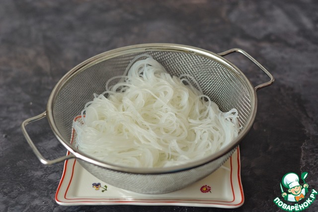 • Фунчозу залейте кипятком и оставьте на 5-10 минут, чтобы она набухла. Откиньте на сито и промойте холодной водой. Дайте стечь воде.