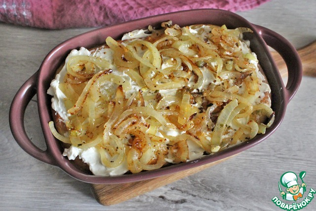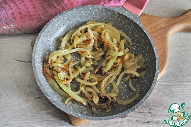 Поверх творожного сыра выложить обжаренный репчатый лук.