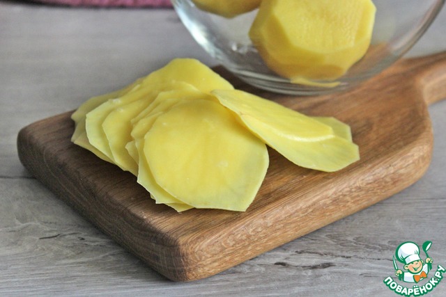 Картофель, очистить, помыть, нарезать на тонкие слайсы толщиной 1-2 мм.