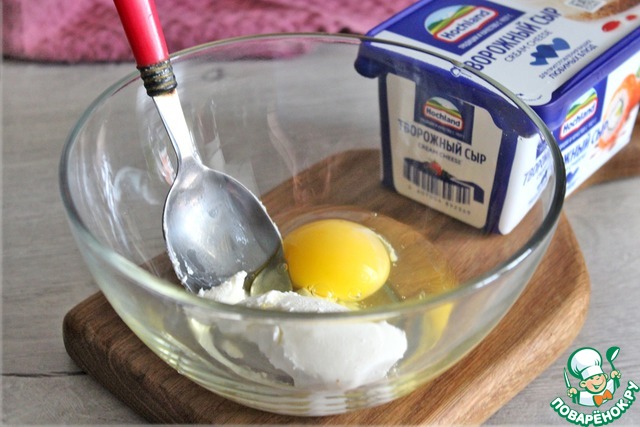 В чашку добавить 1,5 столовой ложки творожного сыра ТМ Hochland, вбить яйца, посолить, добавить приправы, хорошо взбить миксером для однородности.