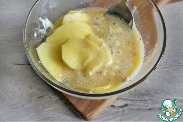 В яично-сырную смесь опустить нарезанный слайсами картофель и хорошо перемешать.