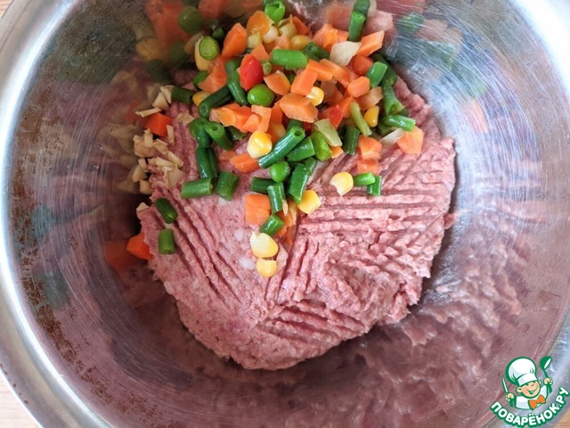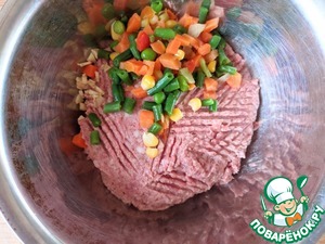 Добавляем к фаршу свежие или замороженные порезанные овощи. У меня уже готовая замороженная Мексиканская смесь из овощей. Кладём мелкорубленный чеснок.