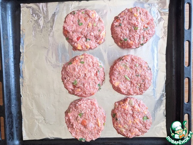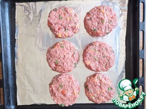 Формуем из фарша круглые котлеты. Противень застилаем фольгой, смазываем маслом, кладём котлеты. Ставим в духовку на 190 градусов. Запекаем 30 минут до готовности. В оригинальном рецепте котлеты панировали в кокосовой стружке.