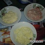 В это время подготовим начинку: яйца, ветчину и сыр натереть на терке