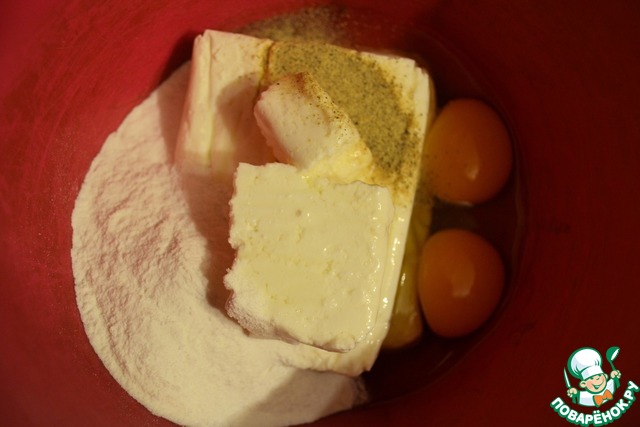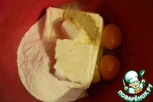 Творог смешать с яйцами, рисовой мукой и белым перцем.