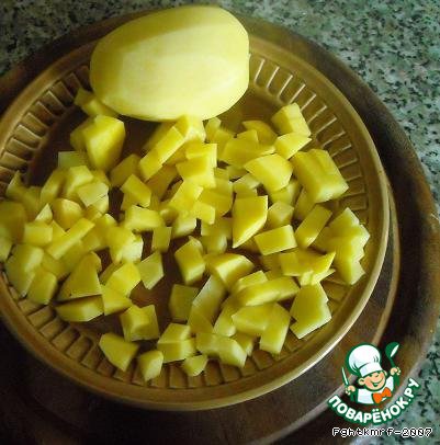 Теперь очередь за картошкой. Ее надо нарезать, желательно ровными и мелкими кубиками (у меня не всегда, правда, получается)