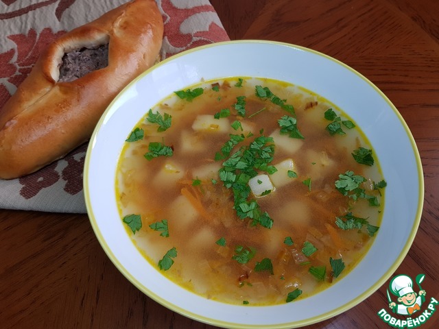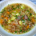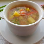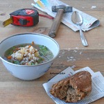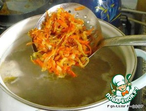 Зашла я как-то (еще до перестройки!) к нашим строителям в бытовку во время обеда и остолбенела... По вагончику разливался упоительный аромат мясного бульона, а наш самый главный прораб Ваныч с секундомером стоит около электроплитки и кричит: "Засыпай!"... Так этот суп в нашей семье и прозвали "Прорабским".
