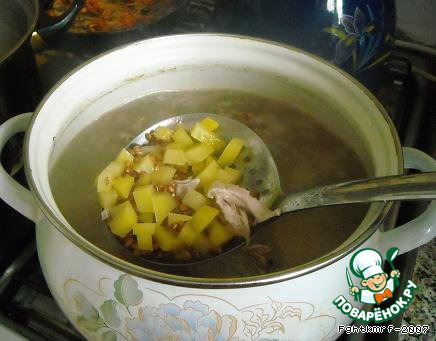 Куриная спинка сварилась, бульончик стал слегка желтоватым. Теперь готовим буквально по минутам: запускаем картошку - закипело- засыпаем гречневую крупу