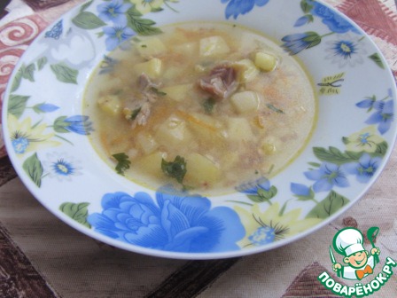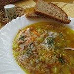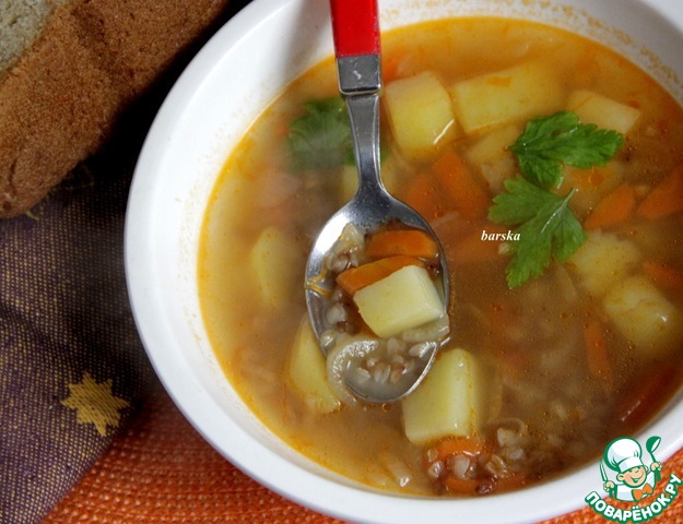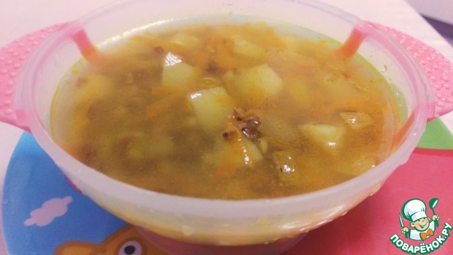 Потом садимся обедать. Вкус у супа с легким оттенком гречки и цвет слегка коричневатый, первое время было очень прикольно.