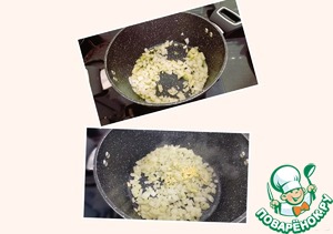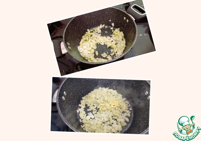 В кастрюле разогреть растительное масло на среднем огне, добавить репчатый лук и пассеровать 3 минуты, добавить чеснок и пассеровать еще 1 минуту на среднем огне.